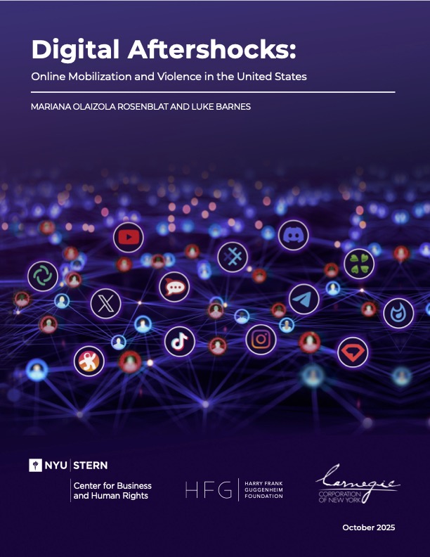 By Mariana Olaizola Rosenblat and Luke Barnes October 2025 Against a backdrop of escalating political violence and deepening polarization in theUnited States, a new HFG-supported report from the NYU Stern Center for Businessand Human Rights examines how extremist actors across the ideological spectrum areexploiting digital platforms to respond to, amplify, and glorify violence. Drawing on open-source intelligence collected between March and September 2025,the report Digital Aftershocks: Online Mobilization and Violence in the United Statestraces how far-right, far-left, violent Islamist, and nihilistic violent extremist communities use cross-platform strategies to recruit followers, justify violence, andsustain propaganda networks. “This cross-ideological scope hopefully allows us to break through the partisan framingthat tends to derail serious policy discussion, and to make principled, rights-respectingrecommendations grounded in observable behavior” said co-author Mariana OlaizolaRosenblat, Policy Advisor on Technology and Law at NYU Stern. The report is part of HFG’s Violence, Politics & Democracy initiative, a multi-year projectexamining how these phenomena interact in mature democracies to understand betterand counter political violence and other forces that damage democratic norms andinstitutions, imperiling the safety of citizens. Read or download the report (PDF)